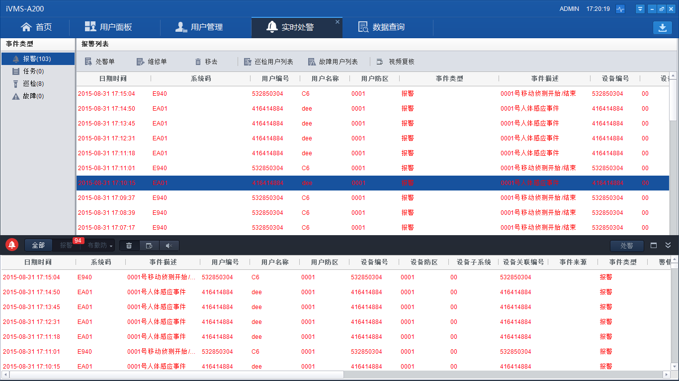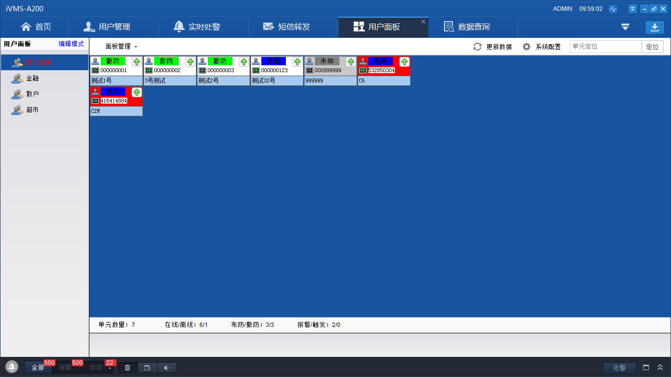 在用戶面板中可顯示用戶當前的布撤防狀態(tài),并可對用戶進行遠程回控等操作,報警時面板上會以紅色進行閃爍提示,可在面板查看當前在線、離線、布防撤防用戶數(shù)量,還可進行快捷查看用戶資料和相關事件等操作。