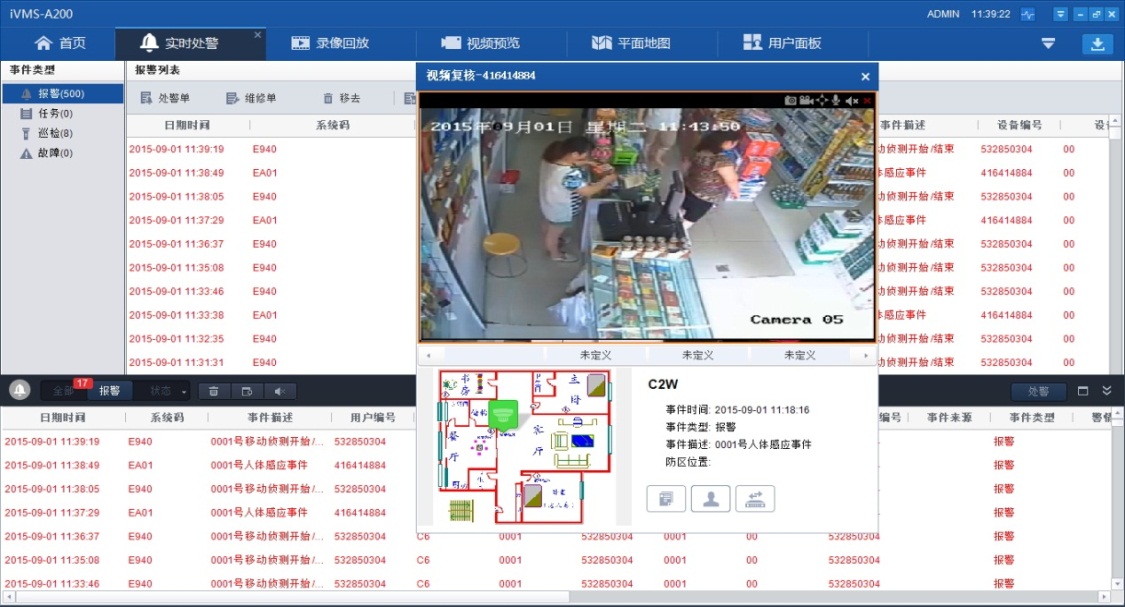 前端用戶的報警后在顯示收到的報警信息,同時iVMS-A200按照用戶預先定義的報警聯(lián)動視頻關系設置,自動彈出報警發(fā)生所在區(qū)域的現(xiàn)場圖像,并同時顯示該用戶防區(qū)圖報警,還可手動進行錄像或截圖,復核時可打開聲音監(jiān)聽現(xiàn)場環(huán)境,打開對講與現(xiàn)場人員通話。